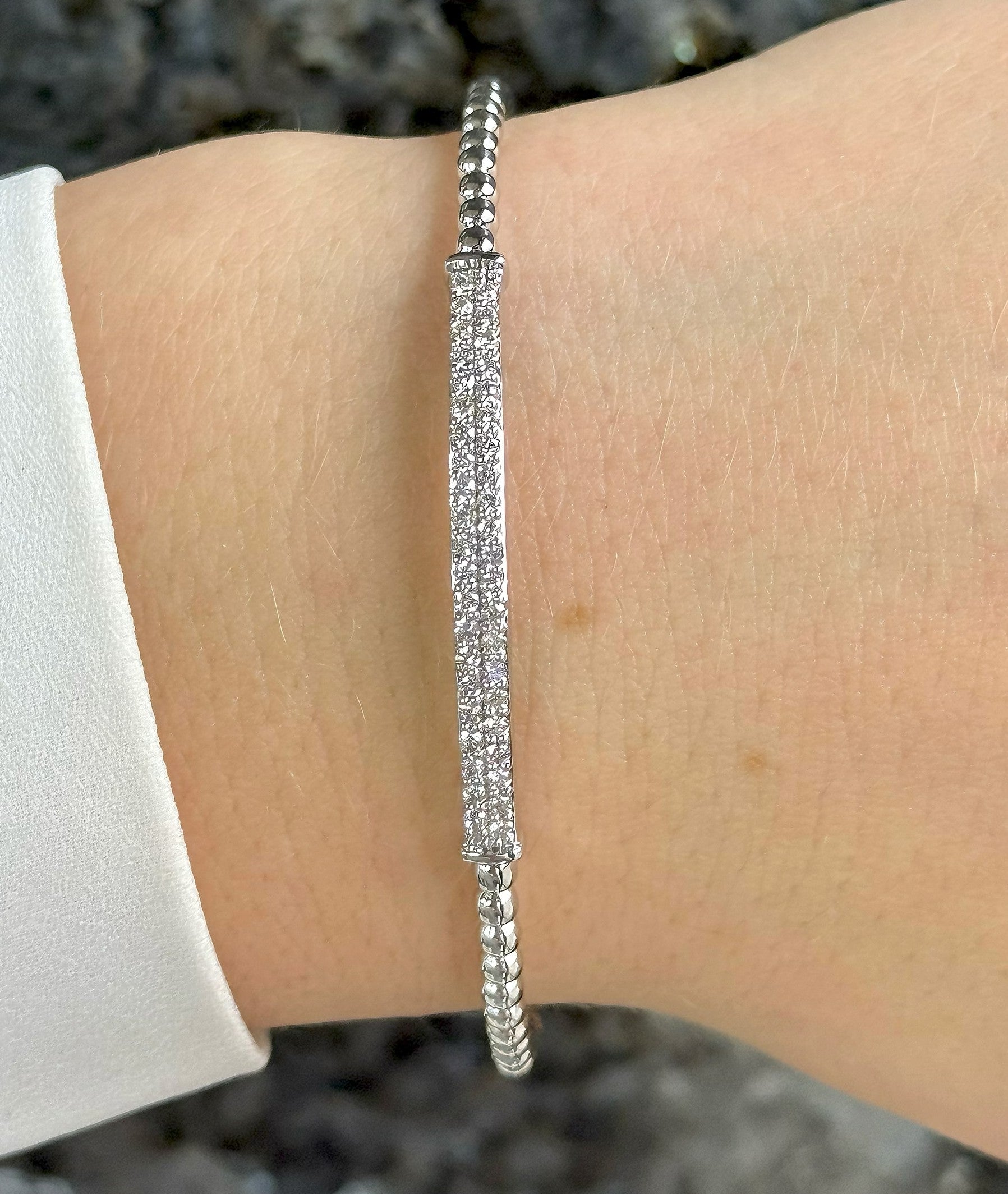 This slip-on bangle features a 14k white gold construction with 0.60 CT of stunning round cut diamonds. The sleek and elegant design makes it a versatile piece that can be worn on its own or stacked with other bracelets for a stunning layered look. Made with high-quality materials and craftsmanship, this bangle is perfect for adding a touch of luxury to any outfit.